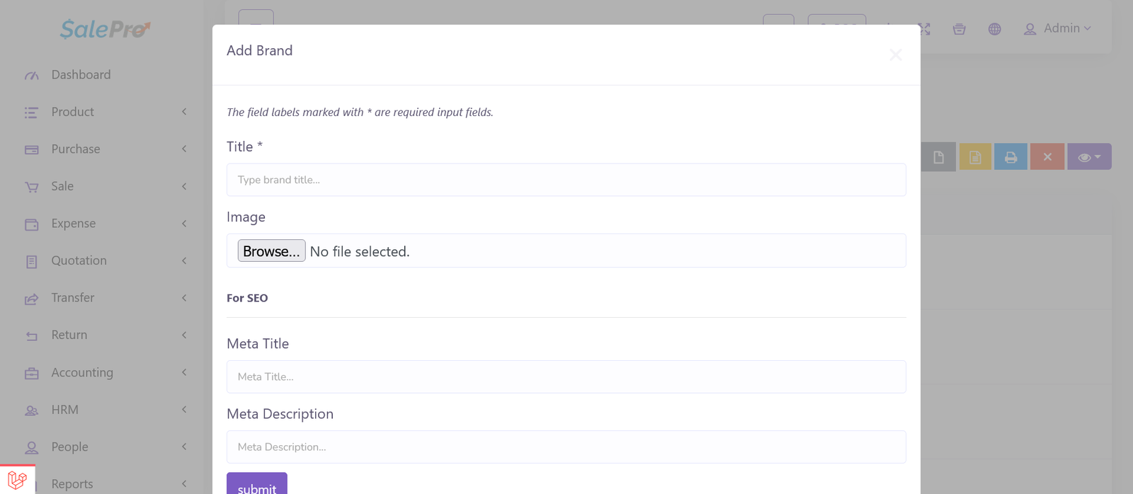 Brand add/edit options are just like SalePro. Few eCommerce specific input fields are added. These input options are listed right at the bottom of the ‘Add Brand’ modal on ‘Brand’ page in your admin panel. While adding/editing a brand, please insert unique meta title and meta description for that specific brand. These information will help serch engines to index/list the pages on their search results, thereby improve your sales potential.