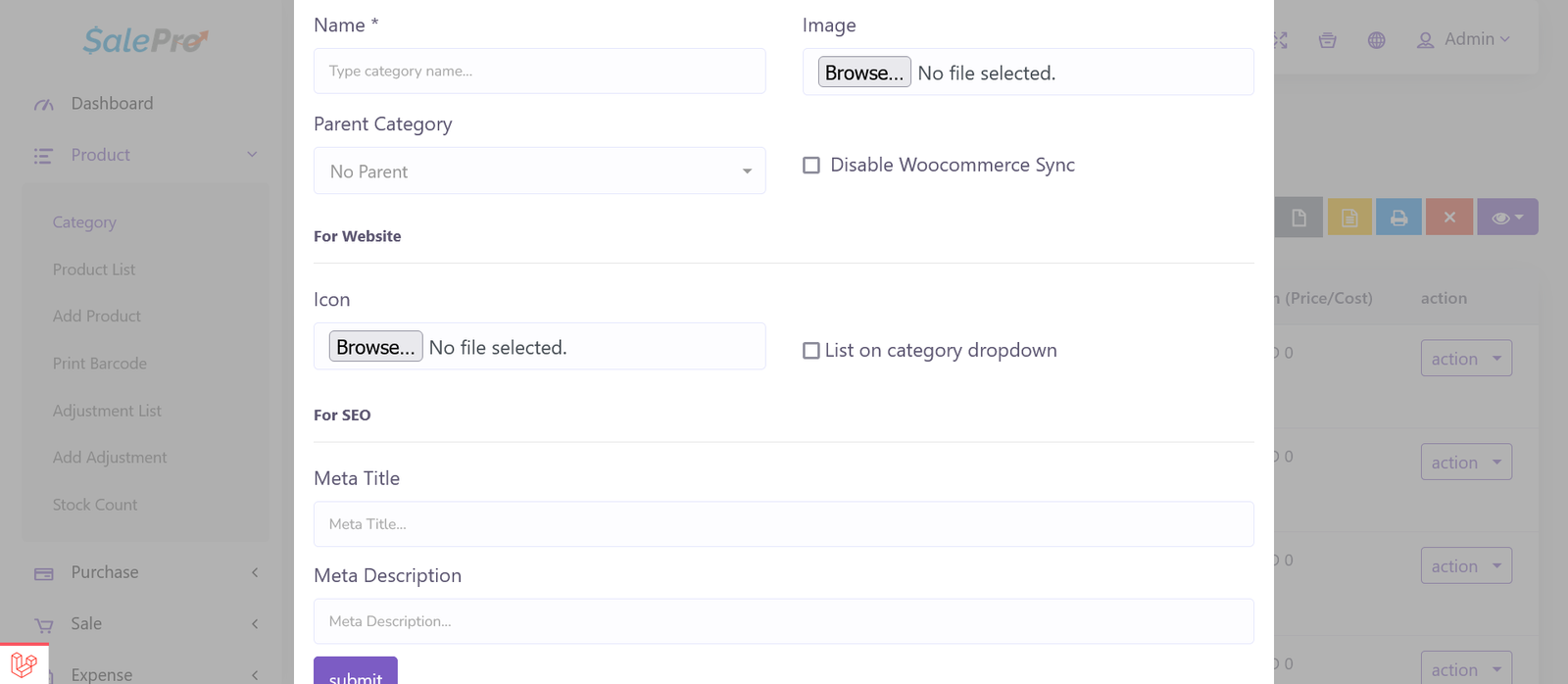 Category add/edit options are just like SalePro. Few eCommerce specific input fields are added. These input options are listed right at the bottom of the ‘Add Category’ modal on ‘Category’ page in your admin panel. While adding/editing a category, please insert unique meta title and meta description for that specific category. These information will help serch engines to index/list the pages on their search results, thereby improve your sales potential.
