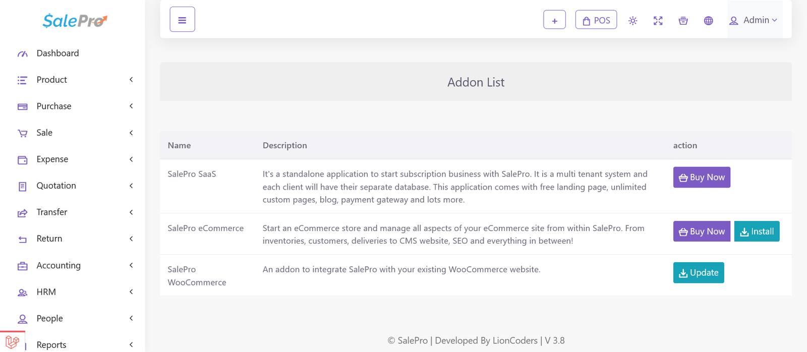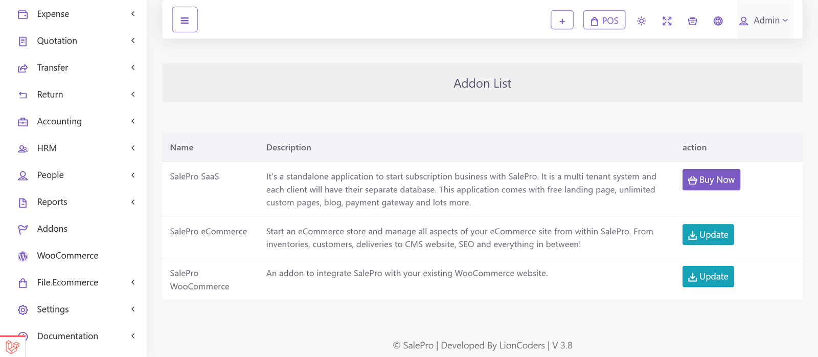 It is presumed that you already have SalePro installed on your server. If you login to SalePro, you should see ‘Addon List’ menu item on your admin panel/dashboard sidebar. Click ‘Addon List’ and on the following page you should see ‘SalePro eCommerce’ listed along with other Add-ons. Unless already installed, it should show ‘Buy Now’ and ‘Install’ button. When installed, it will show ‘Update’ button.