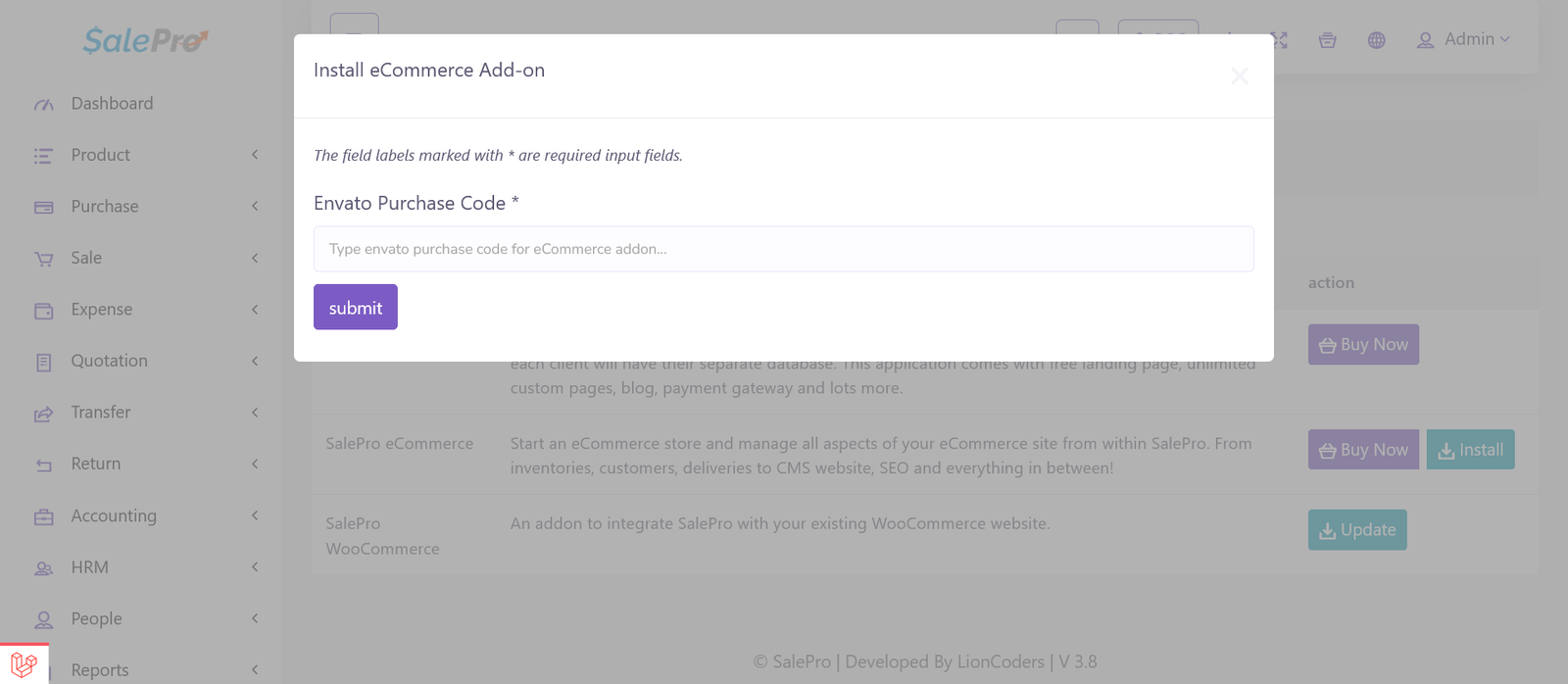 Type your purchase key which you will get from the envato during the purchase. Then click on the submit button. If your purchase key is correct then the addon will be installed automatically and you will see a new option on the left side bar named eCommerce.
