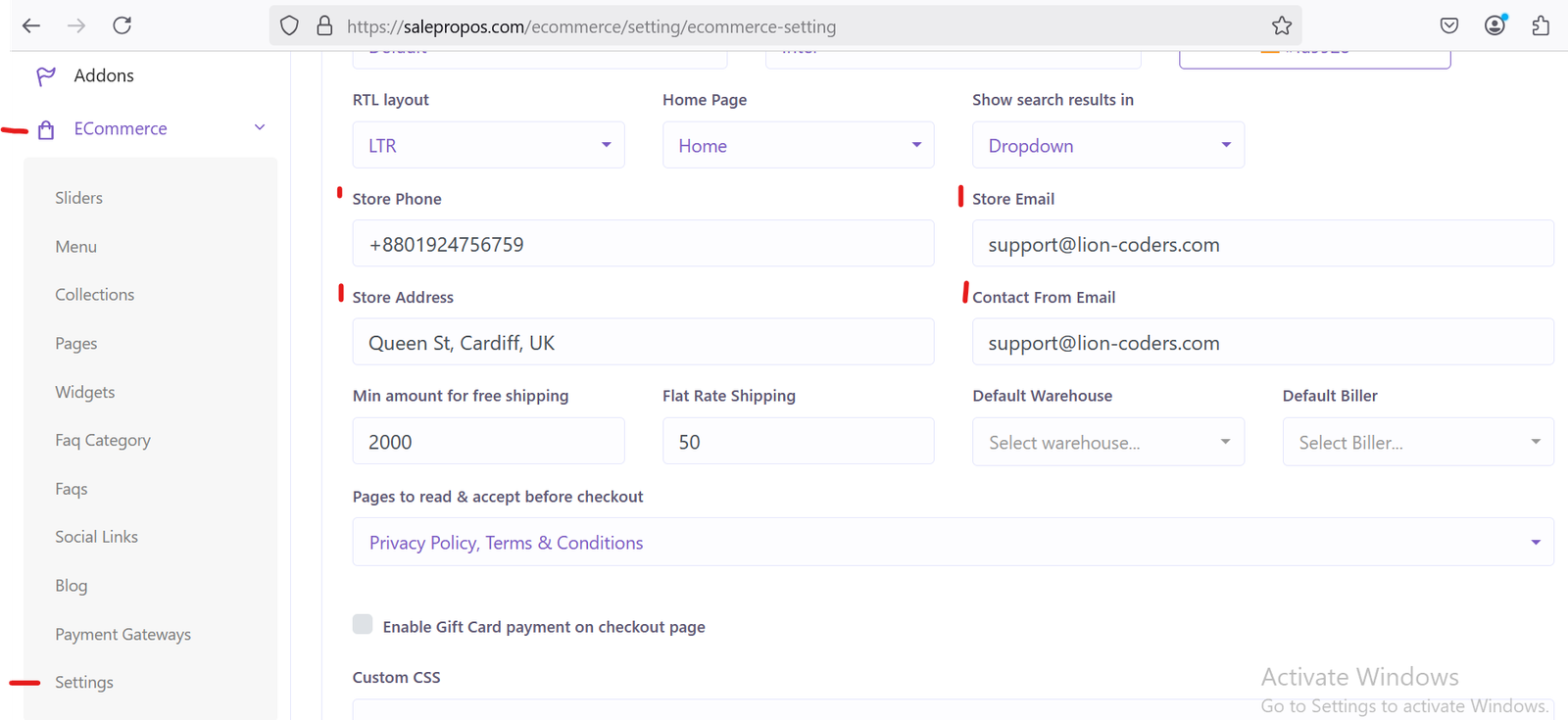 You have to also define your ‘Minimum amount for free shipping’ (if any), ‘Flat rate shipping charge’, default warehouse (from which to ship from), default biller (as in SalePro) on settings page.