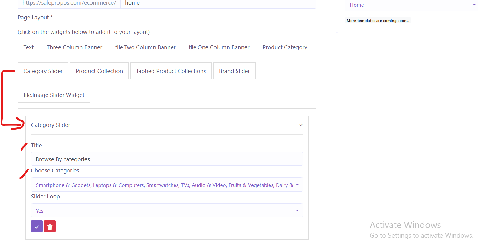 Home template is for the home page. when you select home template, you’ll notice that the text editor get hidden and another layout appears. here, you’ll see some buttons- text, one column banner, product category, category slider, product collection, image slider etc. these are configurable widgets/components that you can add to your home page layout and thereby customize the look and feel of the home page. if you click on these buttons, these get added to the section/container below. after your chosen widgets are added to container, click on each widget to configure it.