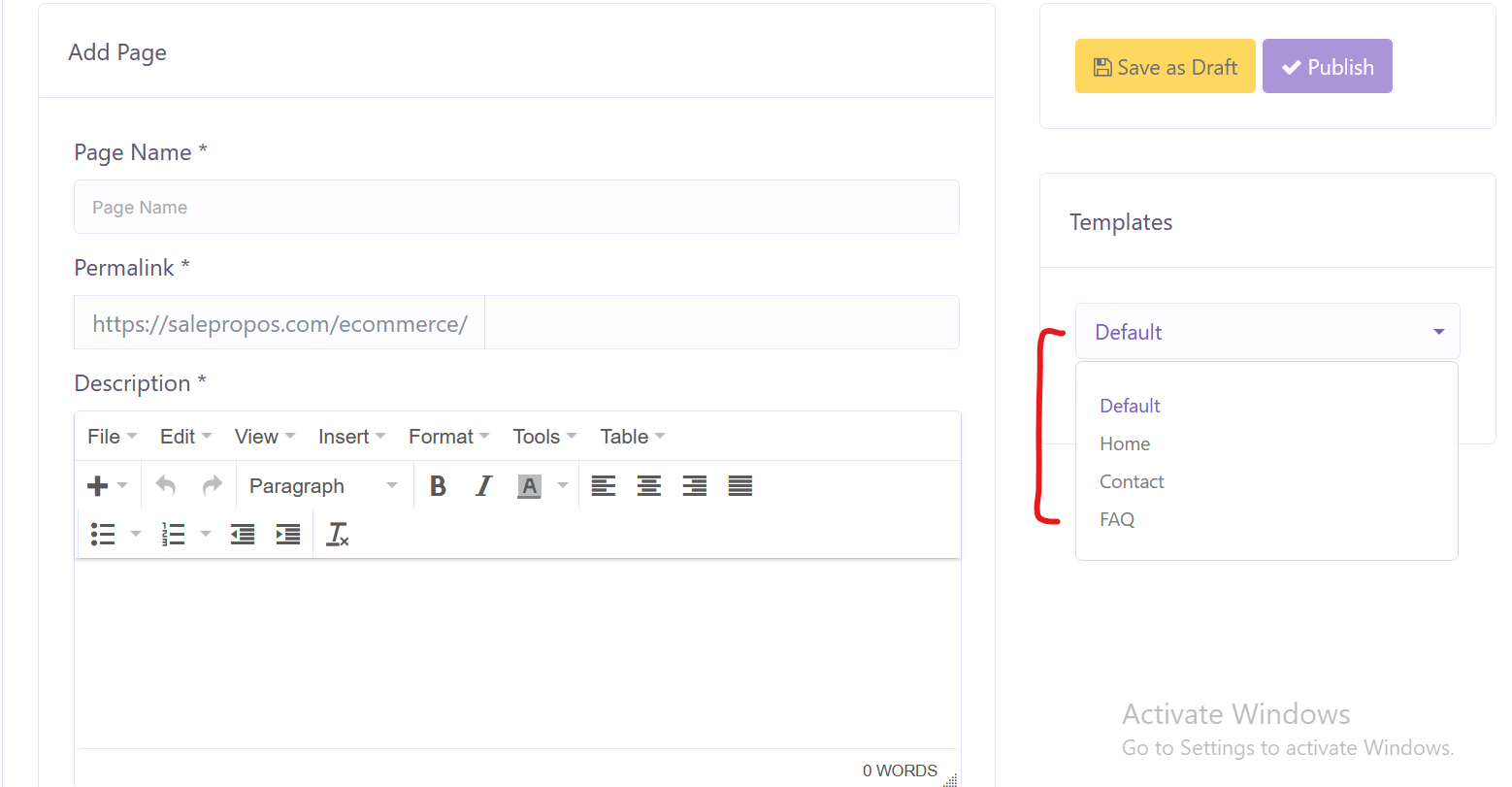 In pages section, you can define or save multiple pages as ‘home’ page. This feature is offered, so that you can create home pages according to your needs. For instance, you want a temporary home page for a festival. So, you’ll need to choose which page you want to show as your current home page in settings page.
