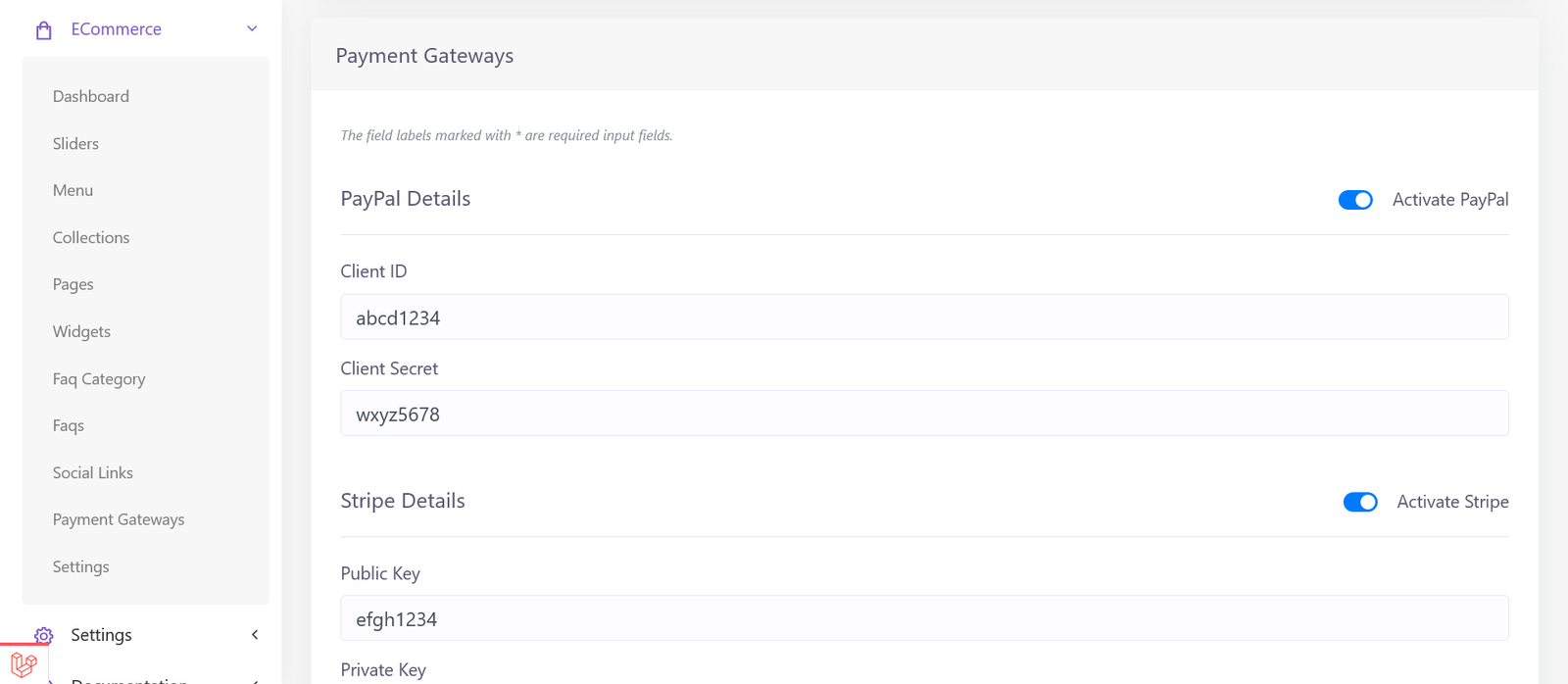 You’ll see available payment gateways on ‘Payment Gateways’ page listed in eCommerce dropdown in your admin panel sidebar.