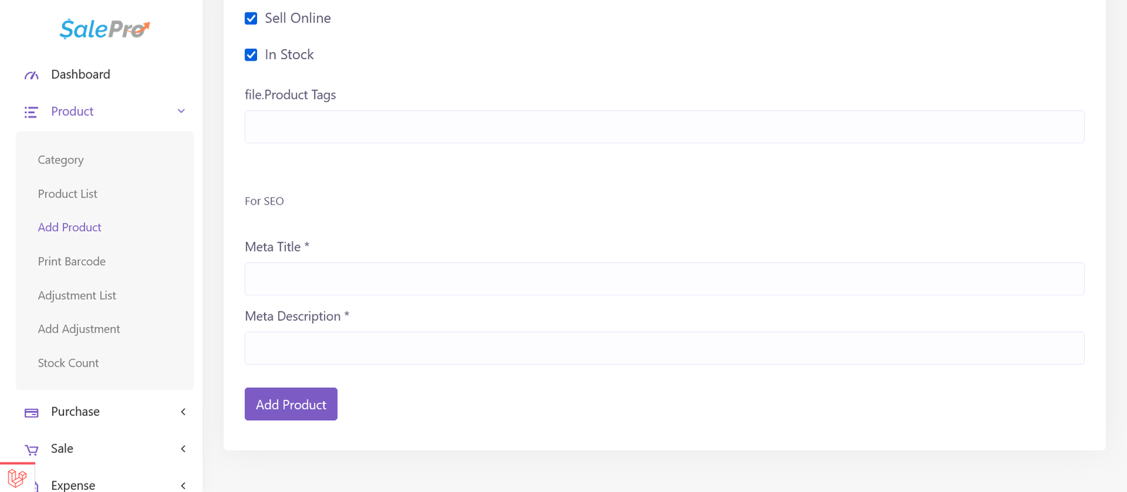 Adding product for eCommerce is just like adding product for POS/inventory in SalePro.In addition to existing input fileds on ‘Add Product’ page, few eCommerce specific input fields are added. These input options are listed right at the bottom of the ‘Add Product’ page.