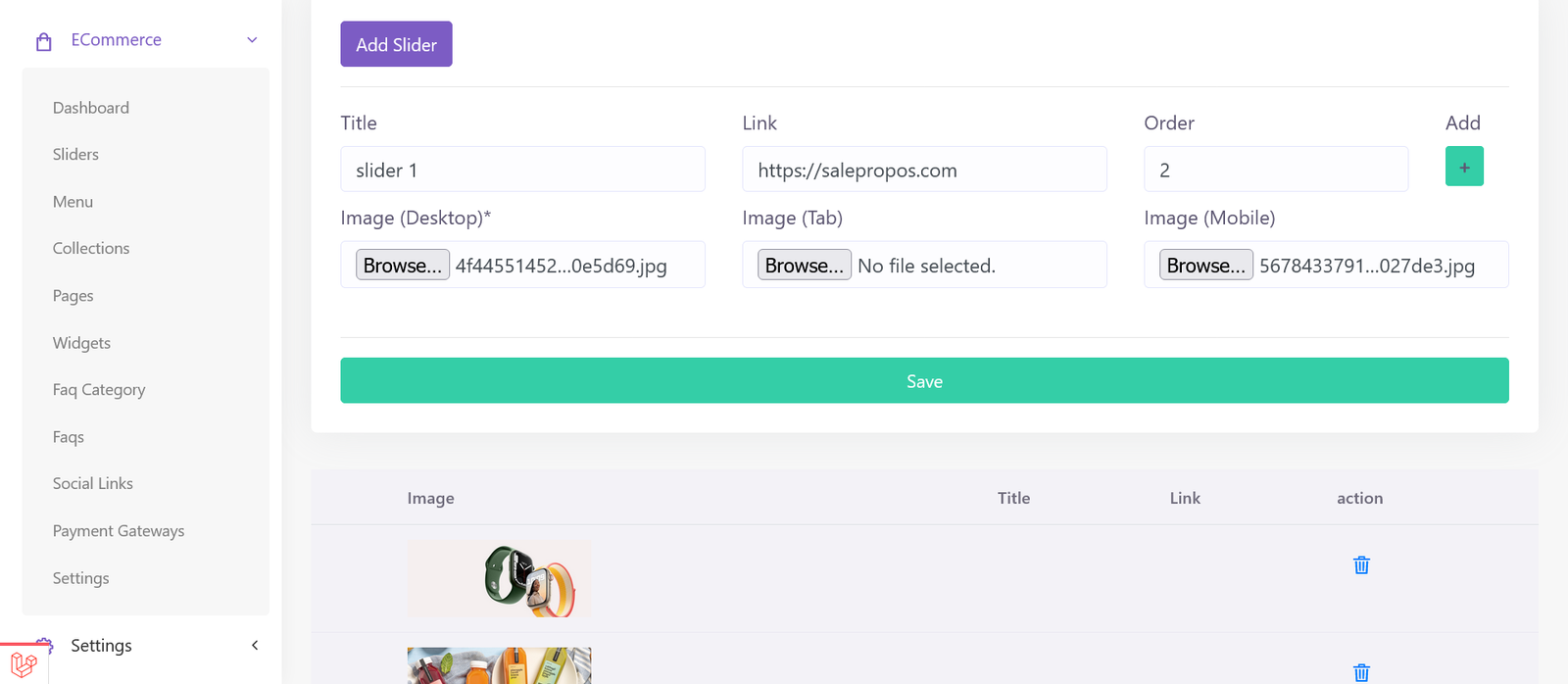 Go to the ‘Sliders’ page from eCommerce dropdown in your admin panel. Click add slider, insert the relevant info and upload images.