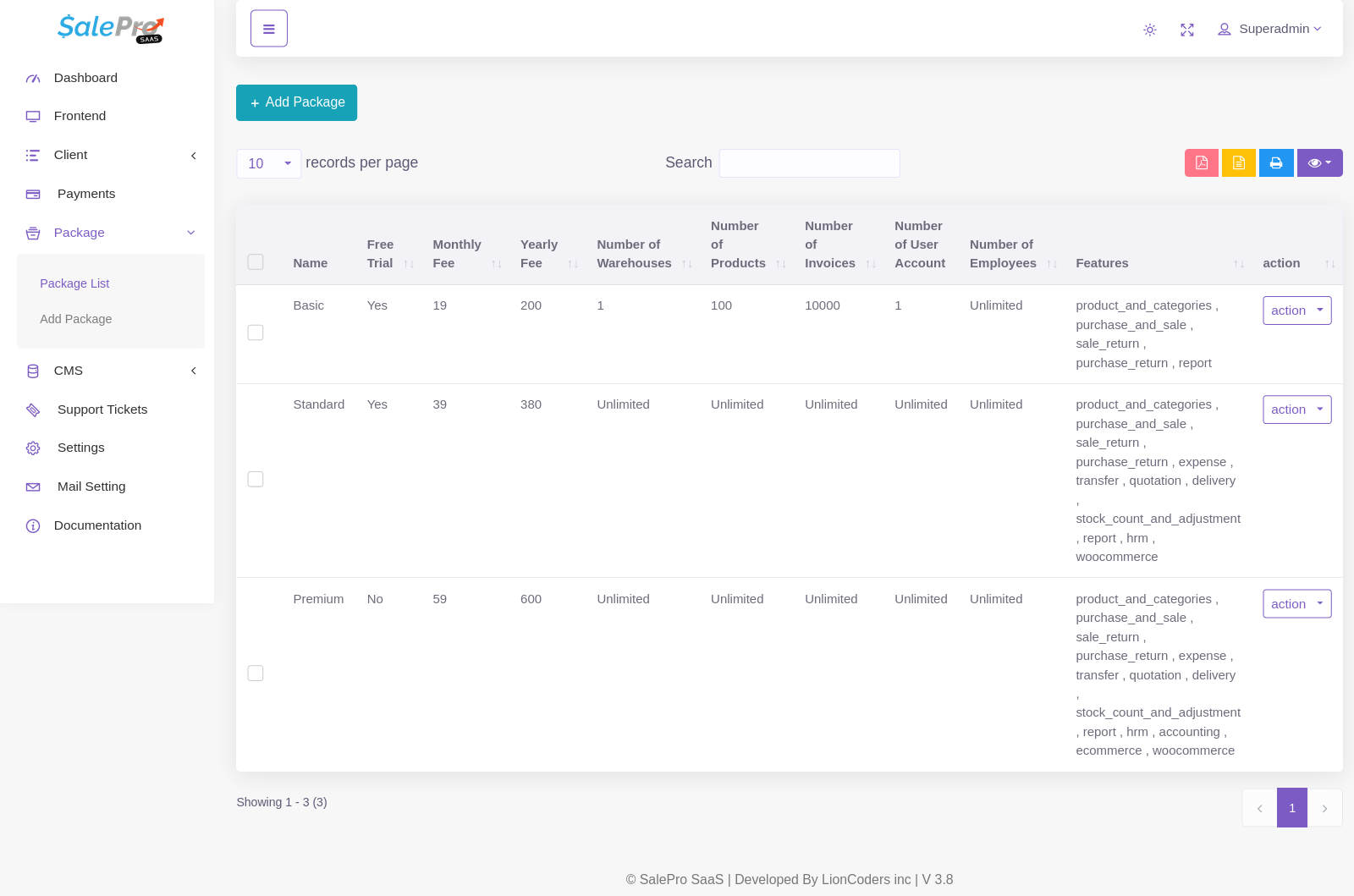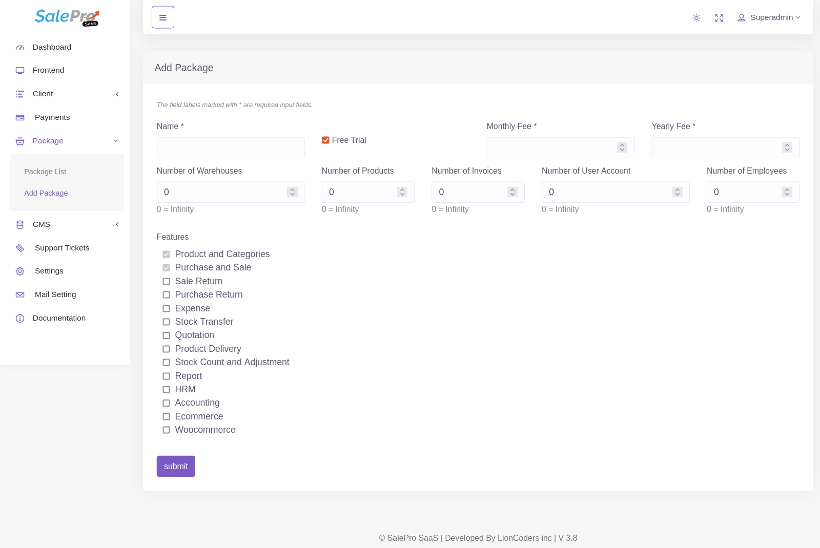 (viii) Goto SaaS, then you have to chose a package where all permission setup. Then you have to create a tenant base on that package. After creating a tenant, then goto it’s database and import the SalePro db which you already exported.
