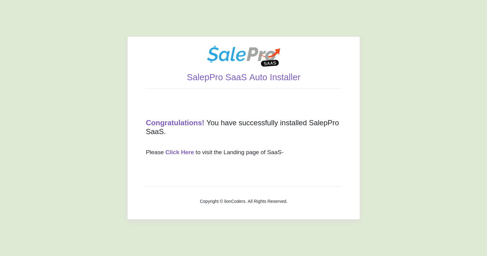 - This is final step. After doing all perfectly then you will get this success page. Then you have click on “Click Here” text. to go landing page of SaaS.