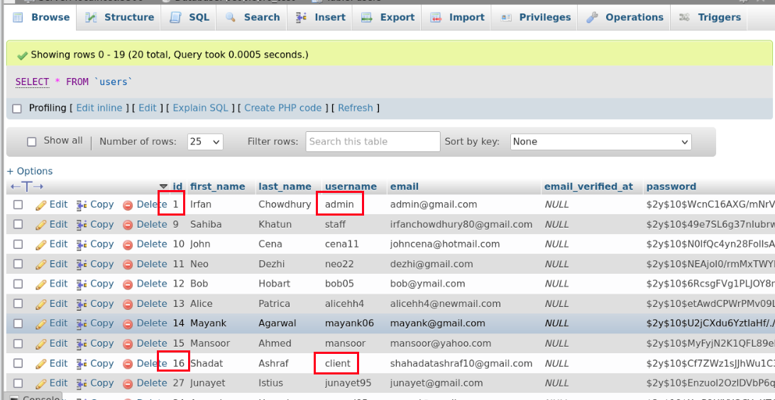(ii) Goto users table and check if there username admin & client exists or not. If exists then remove these rows.